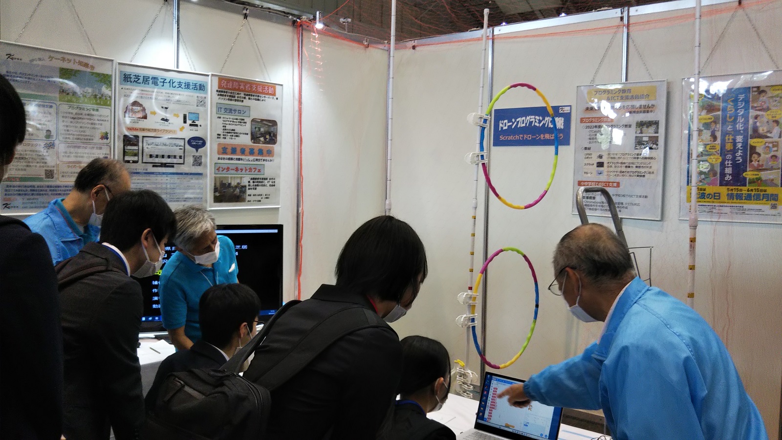 プログラミング体験コーナーでは、ドローンを飛ばすプログラミング(Scratch)に子供たちや学生そして大人の皆さんが挑戦。一時行列ができるほどの盛況ぶりでした。
