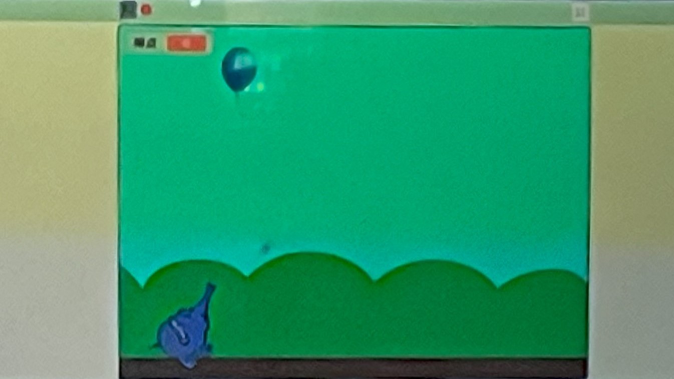 ❝左右に動く風船に、象が鼻から発射するボールを当てて、設定した得点に到達したら、終了画面を表示す❞ というこのゲーム、3つのスプライト(象、ボール、風船)のプログラムをそれぞれ作成し、変数を定義して得点を計算するなど、簡単そうで意外と難しい… - Scratchのアカウントを使って、自宅のパソコンやタブレットで続きを作ることができます。