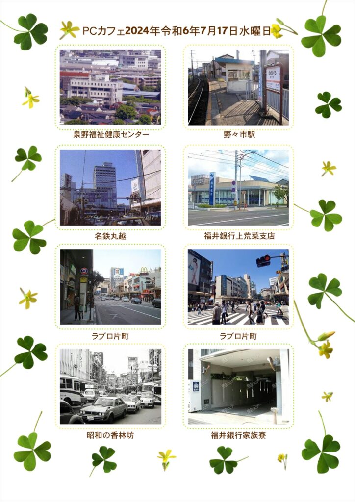 街中の建物や看板、これは時々建て替えたり掛け替えたりされますが、そこに強い興味を持っておられたM.S.さんにとって、急な環境風景の変化は、驚きや不安の素でしか無かったのですが、ネット上に過去の画像が存在することにカフェを通して気付けたことで、生活が大きく変わりました。現在では、貴重な昔の建物・看板画像をネット上から収集したり、お父さんと現地へ写真を撮りに行ったりして、カフェの時間にそれらを1枚のシートにまとめ、宝物として普段も持ち歩いておられます。