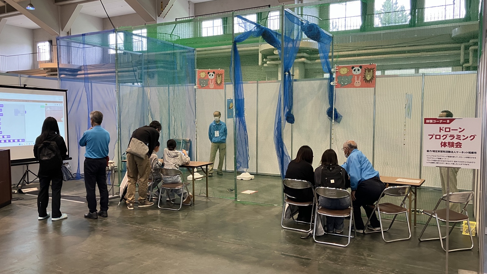 知楽市ブースでは、発達障害支援活動、プログラミング教育活動他の紹介パネル、紙芝居動画上映、プログラミング体験などの展示を行い、24日には、会場内の体験コーナーBで「ドローンプログラミング体験会」も開催しました。