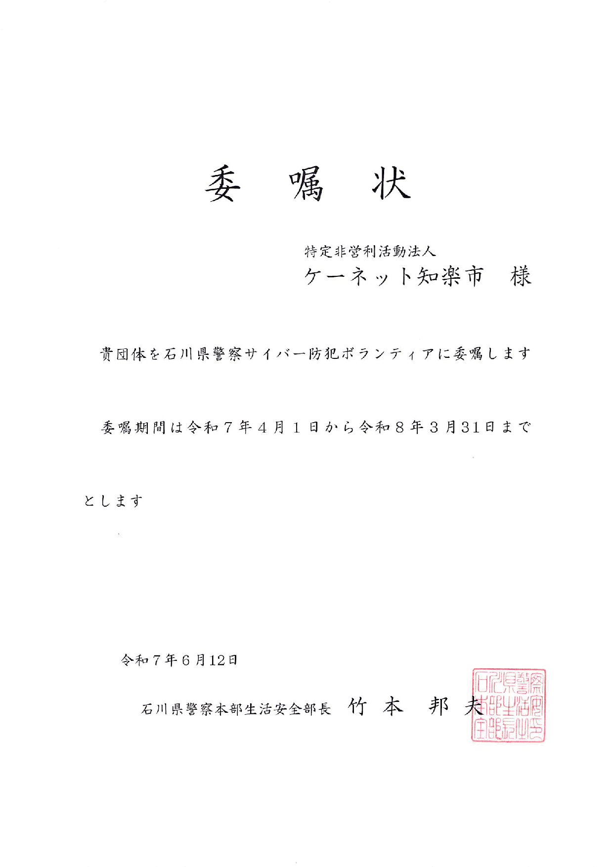 今年も石川県警からサイバー防犯ボランティアの活動を委嘱されました。